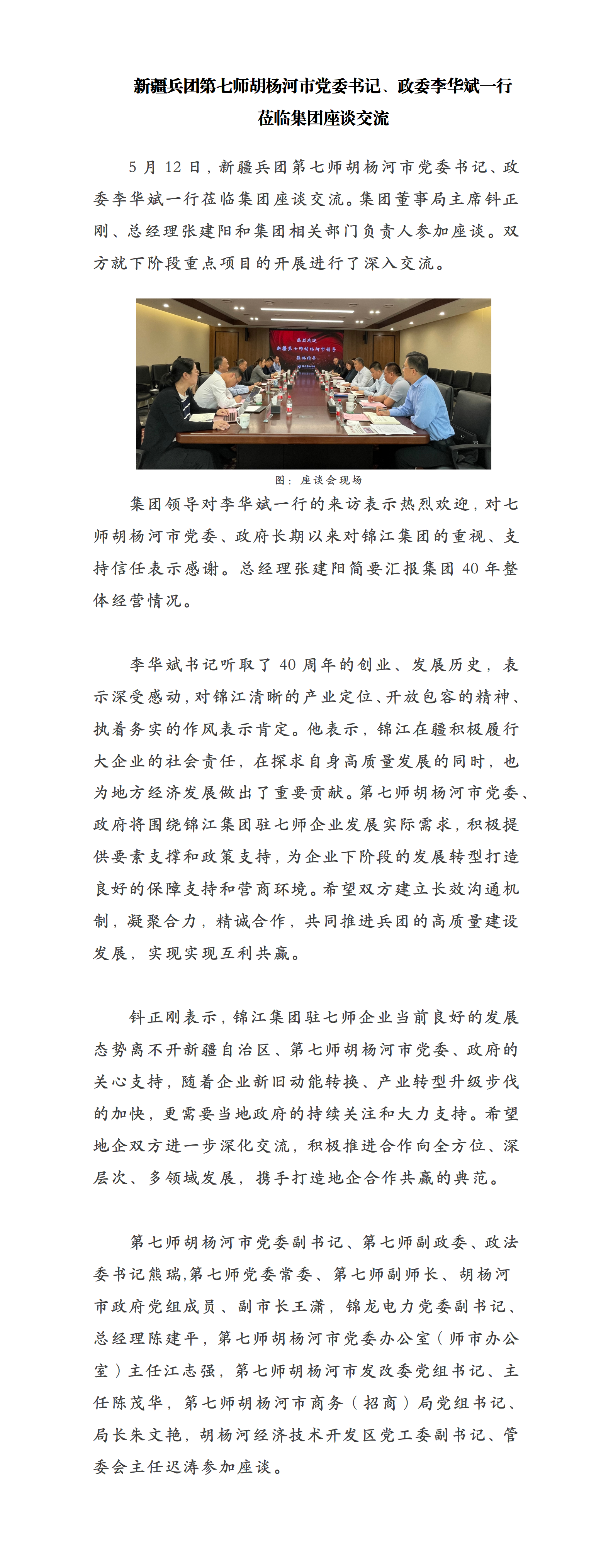 新疆兵團第七師胡楊河市黨委書記、政委李華斌一行 蒞臨集團座談交流